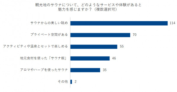 観光地のサウナにどのようなサービスや体験があると魅力を感じるかたずねたところ、最も多かったのは「サウナからの美しい眺め」で114人でした。次いで、「プライベート空間がある」70人、「アクティビティや温泉とセットで楽しめる」55人、「地元食材を使った「サウナ飯」」46人、「アロマやハーブを使ったサウナ」35人と続きます。
