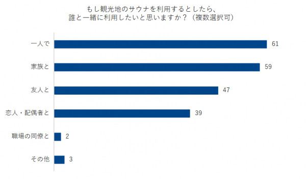 「もし観光地のサウナを利用するとしたら、誰と一緒に利用したいと思いますか?」という問いに対しては、「一人で」が61人と最も多く、続いて「家族と」59人、「友人と」47人、「恋人・配偶者と」39人、「職場の同僚と」2人、「その他」3人という結果になりました。