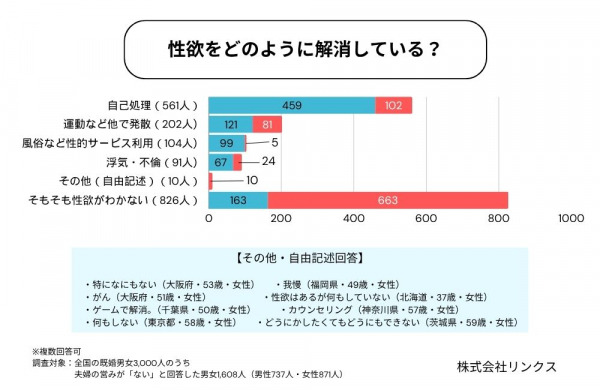 男性は「性欲を処理する」傾向、女性は「性欲そのものが減退する」傾向が際立ちました。