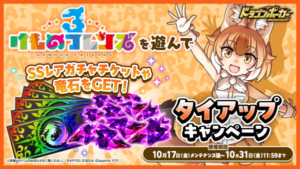 期間中に「けものフレンズ3」のチュートリアルやメインストーリーをクリアすると、竜石最大15個やSSレアガチャチケット5枚をもらえるタイアップキャンペーンを開催いたします。また、『ドラゴンポーカー』内でミッションをクリアすると、「けものフレンズ3」でもアイテムがもらえます。この機会にぜひどちらのゲームもお楽しみください!
