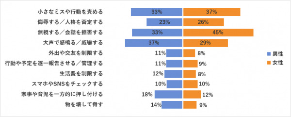 「無視する・会話を拒否する」は女性45%に対し男性33%、「侮辱する・人格を否定する」も女性26%、男性23%と、いずれも女性が上回りました。
