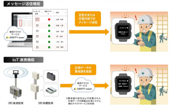 またGRIFFYが提供するクラウド計測サービスと連携し、雨量、風速、傾斜、騒音・振動、粉塵濃度などの計測値が警戒値を超過した際に、装着者に自動通知を行うことで、データ計測から現場作業員への注意喚起まで、作業プロセスの完全自動化を実現します。
