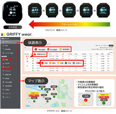 「GenVital LTE」はリストバンドより収集された現場作業員の心拍数と位置情報、現場内の暑さ指数から、現場作業員の体調を4段階で判定し、作業管理者と作業員本人にアラート通知するサービスです。