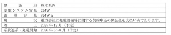 熊本県の第1 号の系統用発電所は、2025 年12 月の予定で、EUKA Power 社並びに共同事業者(現在は未定)が出資し、マーチャント社が管理する特別目的会社(今後設立予定)を事業主体として、系統用蓄電所を着工、事業を開始する予定で、マーチャント社はこの特別目的会社のアセットマネジャーとして、毎年、投資金額の一定割合の管理報酬を、安定的に受領するものです。