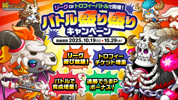 対象期間中の「リーグ」と「トロフィーバトル」で、「リーグ遊び放題」や「連勝でうまPボーナス」、「トロフィーチケット増量」、「バトルで育成増量」といった、クラスやキャラLvを上げやすくなるキャンペーンを開催中です。