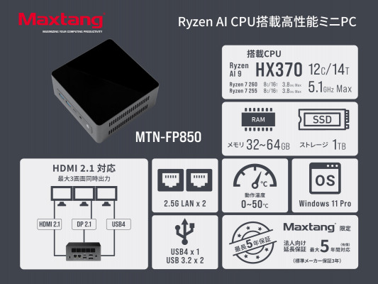 Maxtang MTN-FP850は、高性能なAMD Ryzen(TM) 200/AI HX370プロセッサーを搭載したデスクトップパソコンです。わずか55 mm厚の筐体で、ディスプレイの裏など限られたスペースにも設置することができます。HDMI 2.1ポートを搭載し、ディスプレイポートとUSB4の組合わせで最大3画面出力に対応します。Windows 11 Proをプリインストールするほか、カスタマイズによりWindows 10 IoTやOSレスにも対応、デジタルサイネージや組み込みなど様々な用途に最適です。