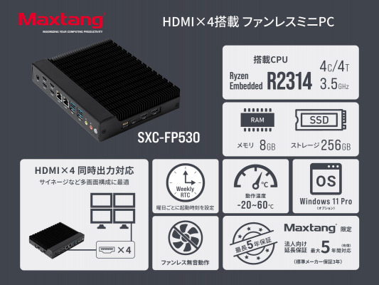 Maxtang SXC-FP530は、4コア/4スレッドの組込み向け長期供給型CPU、AMD Ryzen(TM) Embedded R2314を搭載した極薄ミニPCです。わずか35 mmの極薄筐体で、ディスプレイ裏などの限られたスペースにも設置することができます。-20℃から60℃までの過酷な温度環境にも対応し、屋外や半屋外に設置するデジタルサイネージなどの機器への組み込みにも対応します。HDMI端子で最大4台の画面出力により大画面マルチディスプレイ環境に幅広く対応します。Linux環境向けにOSレスのモデルをラインアップし、オプションとしてWindows 11 Proプリインストールが可能なほか、Weekly RTC(リアルタイムクロック)機能で曜日別に起動時間を設定することができるため、平日・土日など稼働時間が異なる施設での運用にも適しています。