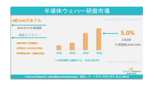 Surveyreports社の専門家たちは、半導体ウェハー研磨市場調査を分析し、2023年に生成された半導体ウェハー研磨市場規模は4億3100万米ドルであることを明らかにしました。さらに、半導体ウェハー研磨市場のシェアは、2033年末までに6億7200万米ドルの感動的な収益を予見しています。半導体ウェハー研磨市場は、2024年と2033年の予測期間中に約5%のCAGRで成長することが提案されています。