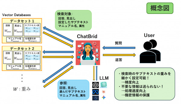図左の「Vector Databases」では、各データセットに「回答(W_ans)」「見出し(W_head)」「サブテキスト群(各W_c,i)」「マニュアル名(W_manual)」「各種属性群(W_category)」を保持。各W(重み)は0.0以上で設定でき、精密な類似度計算に寄与します。