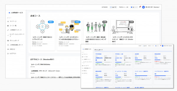 本サービスは、中堅・中小企業に勤める従業員向けの「学び放題コンテンツ」や、人材育成フレームに基づいた必須研修など、体系的な学びを通じてスキルアップを支援します。さらに、育成担当者向けの「研修効果測定」、管理職向けの「エンゲージメント測定」により組織の人材育成状況をデータ化し、育成プログラム改善と企業の成長を促進します。また、これらのサービスをポータルサイト上で一元管理し、育成活動の状況を「人材育成レポート」として可視化することで経営者をサポート。それぞれの立場で活用できる各サービスをLMS(Learning Management System: 学習管理システム)上に集約した、オールインワンパッケージとして提供いたします。