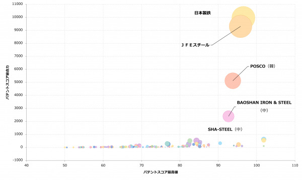 1位 日本製鉄は、日本のみならず他3極のスコアも高水準で、海外展開を重視している事が窺えます。注目度の高い特許には、「曲げ部の構造を最適化した巻鉄心の製造方法」や「高強度でかつ、優れた延性、加工硬化性、絞り性を持つ熱浸漬亜鉛めっき冷延鋼板」が挙げられます。