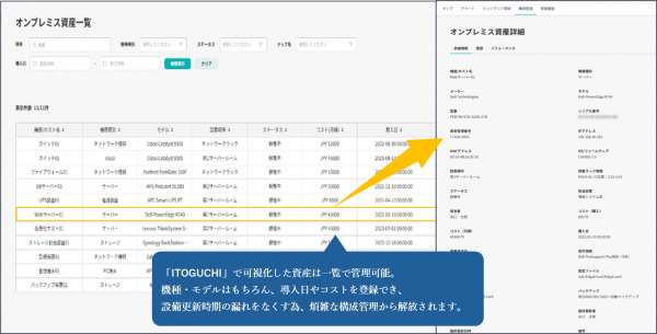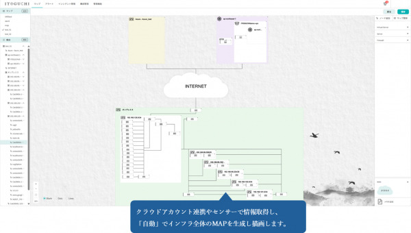 「ITOGUCHI」は、マルチクラウド・マルチベンダー環境に対応したインフラ構成管理ツールで、複雑化するITインフラの構成情報を自動で検知・描画し、常に最新の状態を維持することで、構成管理の効率化と障害対応の迅速化を実現します。