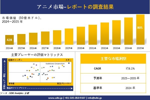 アニメ市場に関する当社の調査レポートによると、アニメ市場規模は 2035 年に約 805億米ドルに達すると予想されています。さらに、2024 年の アニメ市場規模は約 428億米ドルとなっています。アニメ に関する市場調査レポートでは、市場は 2025-2035 年の予測期間中に約 6.1% の CAGR で成長するとも述べられています。