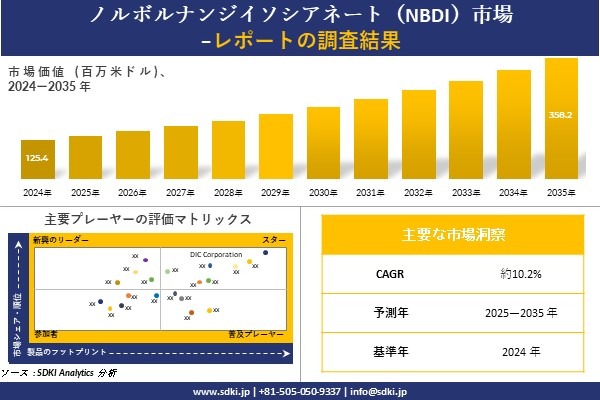 ノルボルナンジイソシアネート(NBDI)市場に関する当社の調査レポートによると、ノルボルナンジイソシアネート(NBDI)市場規模は 2035 年に約 358. 2百万米ドルに達すると予想されています。さらに、2024 年の ノルボルナンジイソシアネート(NBDI)市場規模は約 125.4 百万米ドルとなっています。ノルボルナンジイソシアネート(NBDI) に関する市場調査レポートでは、市場は 2025-2035 年の予測期間中に約 10.2% の CAGR で成長するとも述べられています。