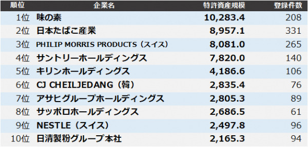 集計の結果、1位 味の素、2位 日本たばこ産業、3位 PHILIP MORRIS PRODUCTS(スイス)となりました。