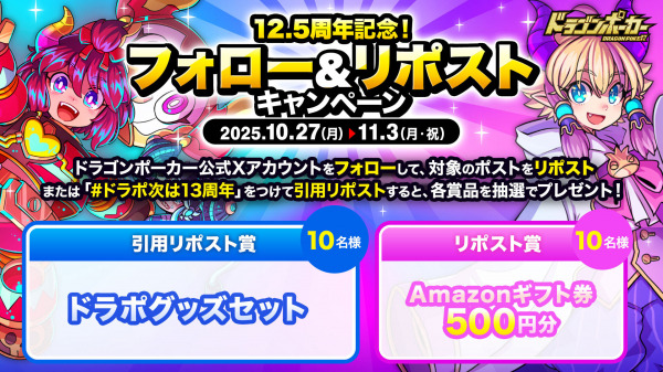 『ドラゴンポーカー』公式Xアカウント(@DragonPoker_aso)が投稿したキャンペーン対象ポストをリポスト、ハッシュタグ「#ドラポ次は13周年」をつけて引用リポストしていただいた方の中から抽選で「ドラポグッズセット」をプレゼント!さらに、リポストしていただいた方の中から抽選で「Amazonギフト券500円分」をプレゼントいたします。奮ってご参加ください!