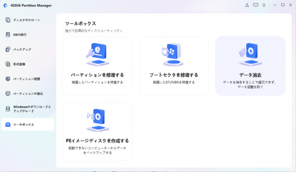 4DDiG Partition Managerは、データ消去機能に加え、システム移行やパーティション管理などにも対応した多機能ツールです。直感的な操作画面で使いやすく、専門知識がなくても安全に作業が進められます。データを確実に消去したい人や、ディスク管理を一括で行いたい人に最適なソフトです。