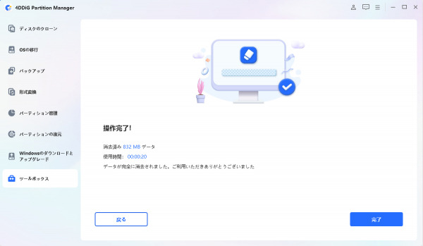 4.ディスクデータの消去には時間がかかりますので、しばらくお待ちください。ディスクの損傷を防ぐため、ディスクの抜き取りやプログラムの終了は避けてください。ディスクデータの消去が成功したら、「完了」ボタンをクリックしてください。