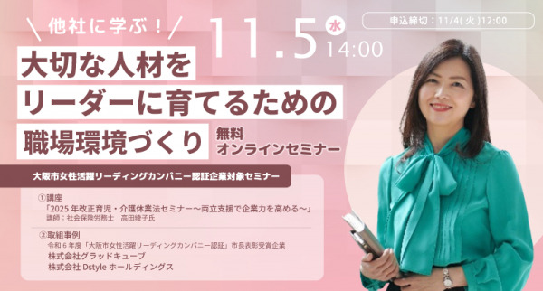 本セミナーは、大阪市女性活躍リーディングカンパニー認証企業等を対象に、先進的な企業の取り組み事例や、2025年10月1日施行の「育児・介護休業法」改正に伴う実務対応を学ぶことを目的として開催されます。