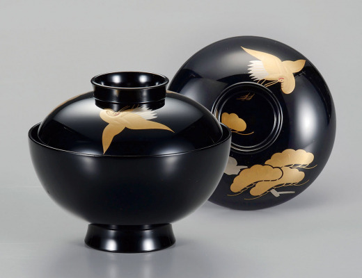 艶やかな黒塗りの椀に、長寿と吉祥を象徴する“松”と“鶴”が金銀の蒔絵で描かれ、