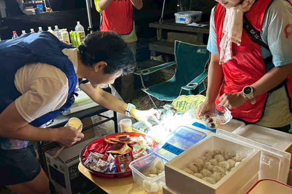 雨が降る中、選手はぬかるんだコースを粘り強く走り、完走を目指しました。レース序盤から中盤にかけては、湿度が高く、大量に発汗するランナーに「塩あんこ餅」が人気。塩分も一緒に摂れるエネルギー補給として重宝していただきました。