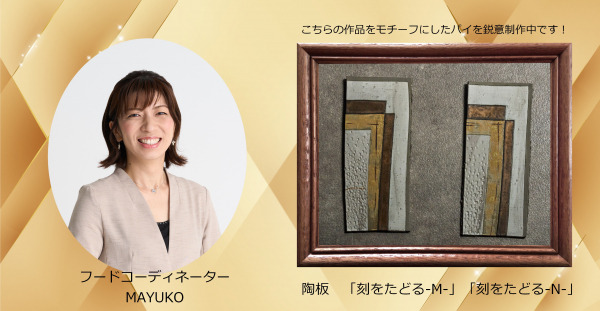 製作に際し、作品のテーマでもある「時」に対して、時間の儚さやもろさをパイで表現することとしました。そして、作家が大切にしている土の温かさや風合いなどをどのような食材を用いて表現するか悩んだのですが、今回はあえて和の食材で落ち着いた作品のテイストに近づけています。