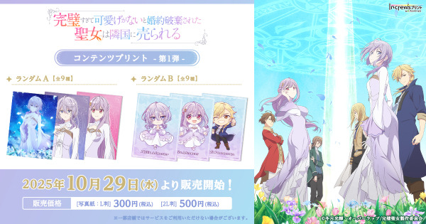 TVアニメ『完璧すぎて可愛げがないと婚約破棄された聖女は隣国に売られる』のコンテンツプリントが、日本全国のコンビニエンスストアを中心とした約55,000店舗のマルチコピー機で一斉に販売開始!