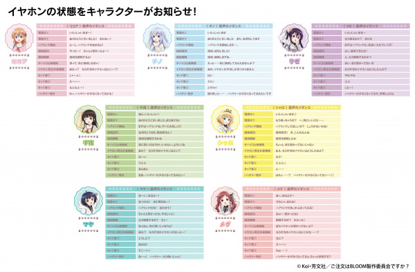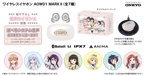 本コラボレーションモデルは作品タイトルを充電ケースに、作品モチーフを左右ハウジングプレートに配置。新規録り下ろし音声ガイダンスは「ココア」「チノ」「リゼ」「千夜」「シャロ」「マヤ」「メグ」の中から1つ選択可能で、お選び頂いた音声ガイダンスを搭載しお届け致します。電源オンやオフ、ペアリング時やタップ音等、それぞれ計11ワードのボイスを楽しめます。イヤホンお届け時期に専用アプリ「ANIMA Studio」にて7キャラクターそれぞれの音声ガイダンスのDL販売を予定しております。TVアニメ 『ご注文はうさぎですか?』ワイヤレスイヤホンご購入者のみDL購入が可能で、初期搭載ボイス(購入モデルのボイス)に加え、DL購入ボイスも楽しめる仕様となっております。パッケージは描き下ろしイラストデザインとなっております。