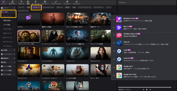 新たにハロウィン限定のステッカー、フィルター、BGM、効果音を大量追加。ゴシック、ヴィンテージ、ファンタジーなど多彩なスタイルを収録し、テンプレートと組み合わせれば数分で完成度の高い動画を演出できます。AIエフェクトと併用すれば、写真も動画も一気にハロウィン仕様に変身。