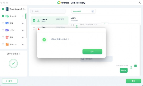2.スキャンを開始します。復元したいLINEトーク履歴を選択します。