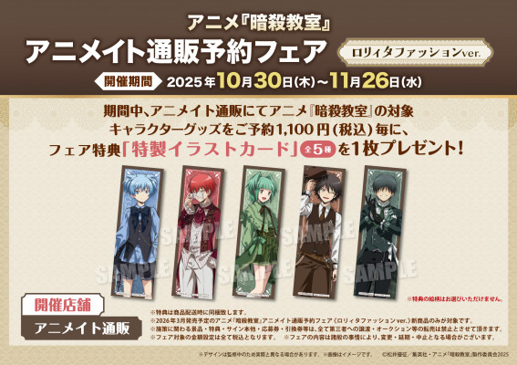 期間中、アニメイト通販にて、対象のアニメ『暗殺教室』関連のキャラクターグッズをご予約1,100円(税込)毎に、フェア特典「特製イラストカード(全5種)」を1枚プレゼント!