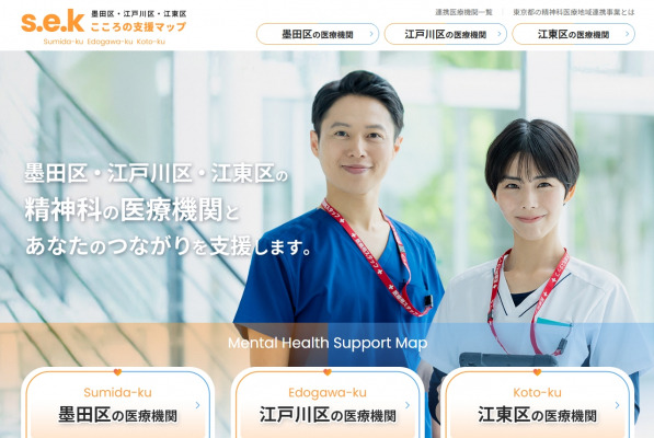 墨田区・江戸川区・江東区 s.e.kこころの支援マップポータルサイトは、 東京都事業 精神科医療地域連携事業(墨田区・江戸川区・江東区)でこのポータルサイトは東京都23区の墨田区・江戸川区・江東区にお住いの皆様に、お住まいの場所から最寄りの「精神科・心療内科の医療機関」の場所を確認していただくためのポータルサイトです。