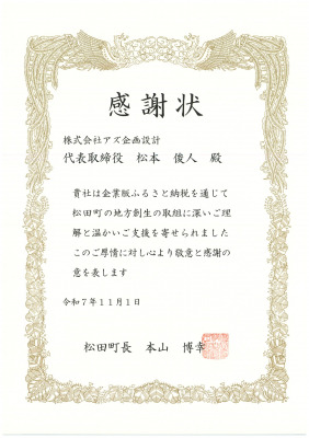 このたび松田町様より、感謝状を頂戴できることを心から嬉しく思います。ありがとうございました。