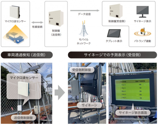 ○これにより、工事出入口から出庫する工事車両の運転手や、交通誘導を行う作業員が「あと何秒で車両が現場出入口付近を通過するか」を把握することが可能となり、視認性の悪い箇所の安全対策を実現します。
