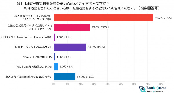 「YouTube等の動画コンテンツ」(3.0%・3人)や「SNS(例:LinkedIn、X、Facebook等)」「企業ブログや採用ブログ」(いずれも1.0%・1人)は非常に少なく、動画やSNSによる情報発信はまだ転職活動の主要ルートにはなっていない現状が示されました。