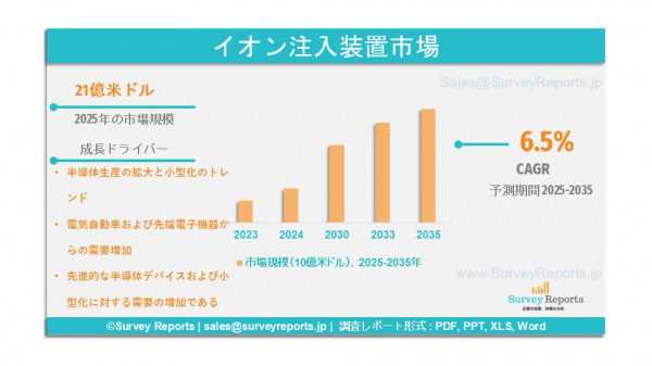 Surveyreportsのアナリストによる定性的なイオン注入装置市場分析によれば、イオン注入装置市場の規模は、「半導体生産と小型化の進展」「電気自動車および先端電子機器からの需要増加」「高性能半導体への需要拡大」「5GおよびAI技術の普及拡大」などの要因によって拡大すると見込まれている。イオン注入装置市場における主要企業としては、Applied Materials, Inc.、Axcelis Technologies、Ion Beam Services、INTEVAC, Inc.、Kingstone Semiconductor Joint Stock Company Ltd.、ULVAC Technologies Inc.、日新イオン機器株式会社(Nissin Ion Equipment Co. Ltd.)、High Voltage Engineering Europa B.V.、Idonus sarl、ALB Materials, Inc.、Brookhaven Instruments Corporation、Eaton Corporation、Mattson Technologyなどが挙げられる。