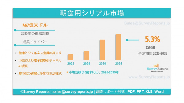 Surveyreportsの専門家による分析によれば、朝食用シリアル市場の規模は2025年に467億米ドルを創出したとされている。さらに、この市場規模は2035年末までに745億米ドルに達すると予測されている。朝食用シリアル市場は、2025年から2035年の予測期間において年平均成長率(CAGR)約5.3%で成長すると見込まれている。
