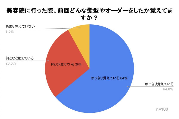 「美容院に行った際、前回どんな髪型やオーダーをしたか覚えてますか?」の質問では、『はっきり覚えている』が64%、『何となく覚えている』が28%、『あまり覚えていない』が8%という結果となりました。