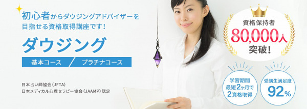 講座で学ぶ内容は日本占い師協会の「ダウジングアドバイザー(R)」(https://www.uranai.org/dowsing/)、日本メディカル心理セラピー協会の「ダウジング士(R)」(https://www.domap.net/uranai/dowsing/)それぞれの資格試験対策になっています。