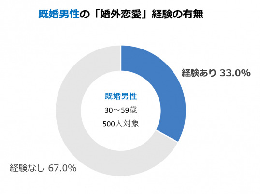 「婚外恋愛に関する実態調査 第1報」(ヒールメイト調べ)によると、既婚男性の婚外経験割合は33.0%。およそ3人に1人が経験している形になります。