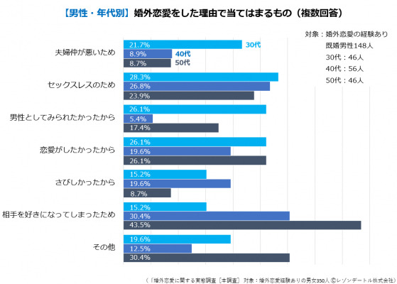 第4報で「婚外恋愛の理由」を尋ねたところ、次の結果になりました。男性が婚外に向かうのは、決して性的な意味合いだけではないのです。