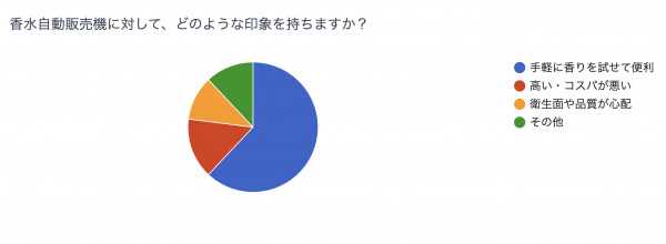 多くの回答者は「手軽さ」や「新しさ」に魅力を感じており、特に人目を気にせず香りを選べる点や、少量から試せる利便性が支持を集めています。一方で、価格や品質管理に対する不安も一定数見られ、今後の普及に向けてはこうした課題への対応が重要になると考えられます。