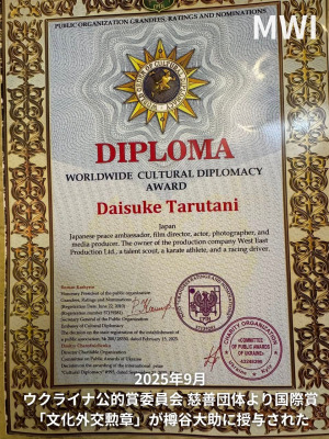 (東京発) ウクライナ公的賞委員会 慈善団体は、日本の平和活動家であり武道団体幹部でもある樽谷大助氏に対し、国際賞「文化外交勲章(Cultural Diplomacy)」を授与したと発表しました。この勲章は、ウクライナ侵攻勃発時より継続された樽谷氏の献身的な支援活動が評価されたものです。
