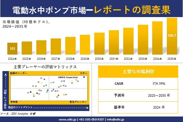 電動水中ポンプ市場に関する当社の調査レポートによると、電動水中ポンプ市場規模は 2035 年に約 186.7億米ドルに達すると予想されています。さらに、2024 年の 電動水中ポンプ市場規模は約 101億米ドルとなっています。電動水中ポンプに関する市場調査レポートでは、市場は 2025-2035 年の予測期間中に約 6.39% の CAGR で成長するとも述べられています。