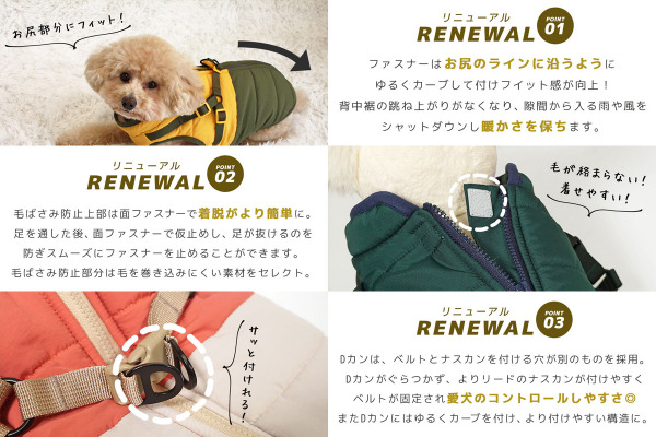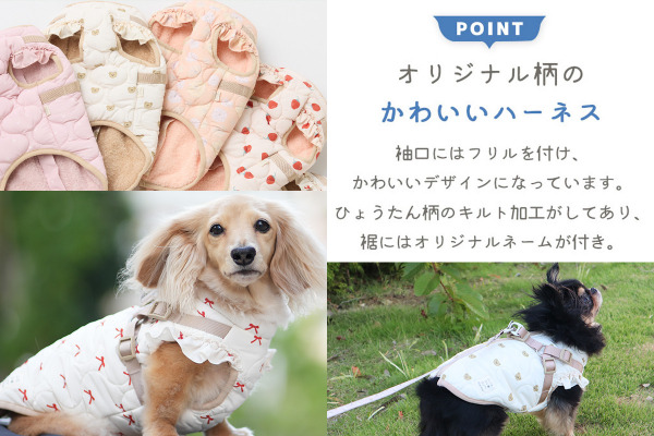 暖かなダウン風アウターとハーネスが一つになった防寒ハーネスが大切なパートナーの冬のお散歩を一層楽しくします。