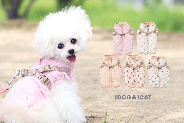 可愛らしさとやわらかさ、暖かみのあるデザインの【iDog fleur(アイドッグ フルール)】シリーズの、総裏仕様のあったかダウンとハーネスが一つになった防寒ハーネスです。