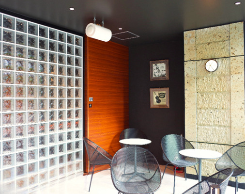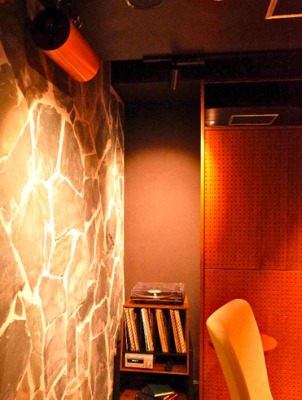 さらにその奥には有料でエムズシステムの波動スピーカーをゆっくりと堪能できるパーラールームを設置。ターンテーブルに載せたアナログレコードの音や、顧客自身のスマートフォンからブルートゥースで好きな楽曲を簡単に楽しめるシステムを導入しました。