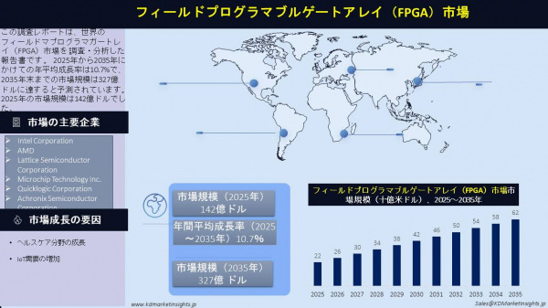 この調査レポートは、世界のフィールドマプログラマガートレイ(FPGA)市場を 調査・分析した報告書です 。 2025年から2035年にかけての年平均成長率は10.7%で、2035年末までの市場規模は327億 ドルに達すると予測されています。2025年の市場規模は142億ドルでした。