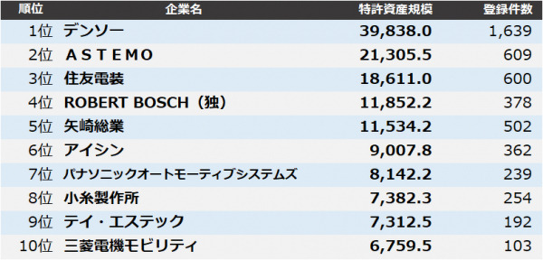 4位 ROBERT BOSCHは「高速かつ安定して制御することができる鞍乗型車両用のブレーキ力制御ユニット」、5位 矢崎総業は、長岡パワーエレクトロニクスおよび東京海洋大学と共同保有である「電力の脈動を吸収することが可能な小型の充電器」が、注目度の高い特許として挙げられます。