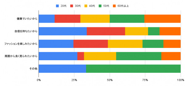 理想の体型を目指す一番の理由として、全体の53.3%が「健康でいたいから」を挙げました。20代では「自信を持ちたいから」(41.7%)が最も高い一方、50代以降は「健康でいたいから」が65.0%~68.3%と圧倒的で、年代とともに「健康」を軸に自分の心身を守る意識へと変化していることが分かりました。